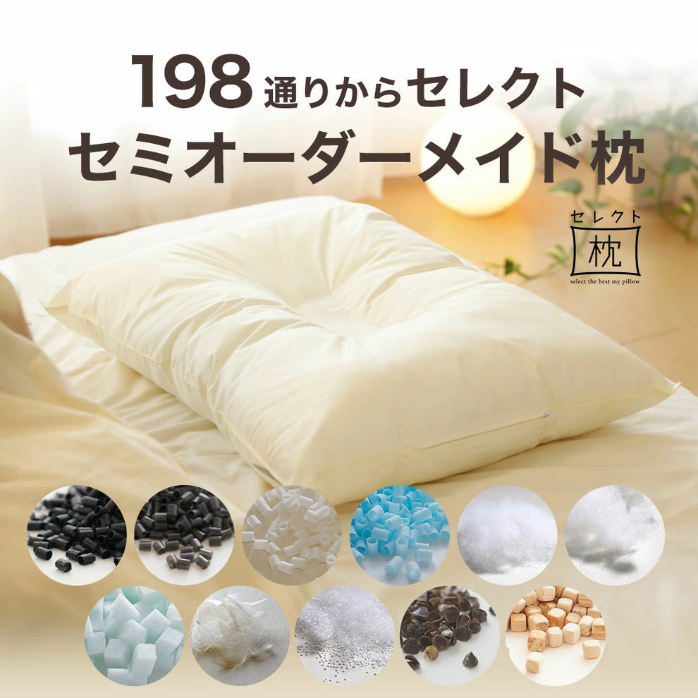 「セレクト枕」は、自宅にいながら枕のサイズ・高さ・形状・素材を組み合わせて自分好みの枕を選べるセミオーダーメイド枕です。