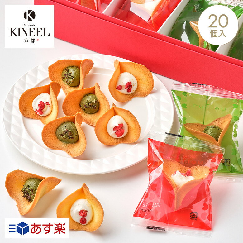 KINEEL(キニール)「ルフル」は、花型のラングドシャにクリームを挟んだ焼き菓子。この商品にはミルク味と抹茶味の2種が詰め合わされており、ミルク味にはいちごがトッピングされています。