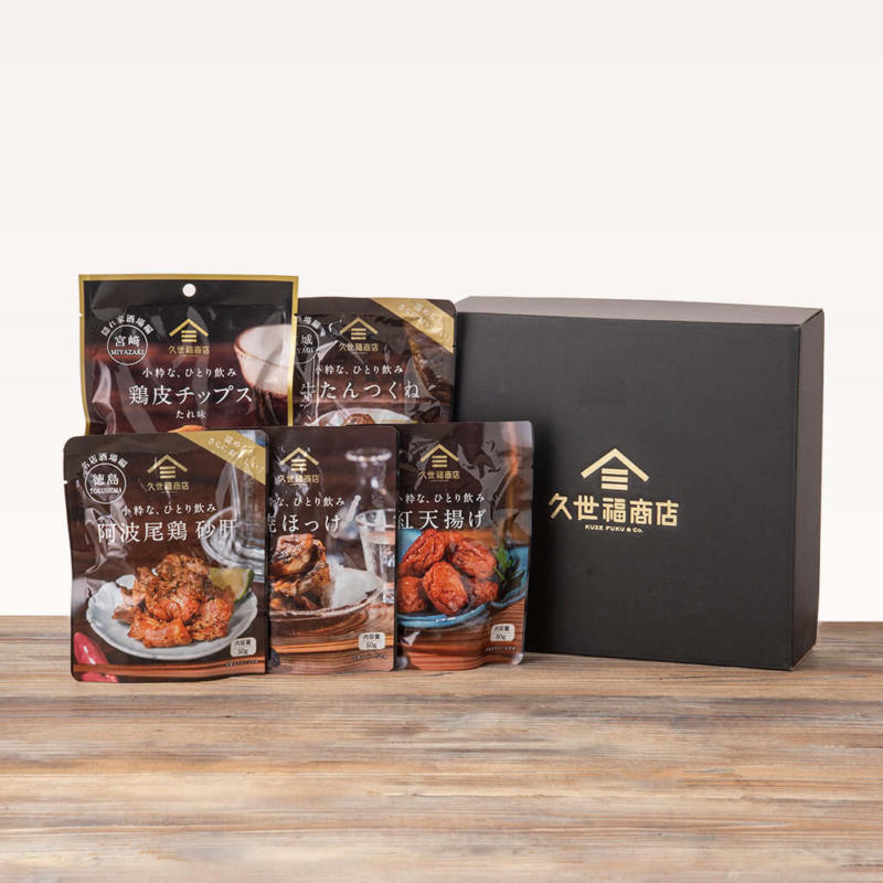久世福商店「ご当地おつまみ 小粋な、ひとり飲み詰め合わせギフト」は、阿波尾鶏の砂肝・牛たんつくね・紅天揚げなど、全国のご当地おつまみを詰め込んだギフトセット。